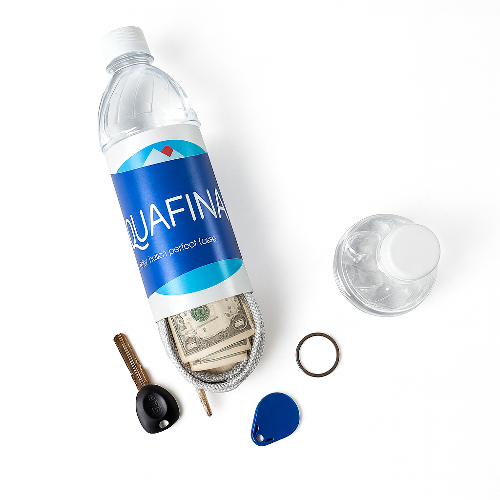 To store your belongings, simply unscrew either the top or bottom half of the bottle. This reveals a hidden compartment where you can safely keep your items.